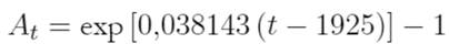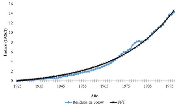 Volviendo al modelo estándar de Solow, y los supuestos que le acompañan, el factor A t se ajustó de forma independiente al residuo no explicado que una vez fue llamado “progreso tecnológico” o, más recientemente, la productividad total de los factores (PTF). En el presente trabajo se determinó que el “mejor ajuste” para la función de progreso técnico en Colombia durante todo el período 1925-1997 (que se muestra en la Figura 4) está dado por la siguiente expresión: