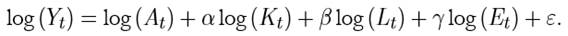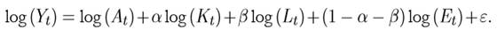 En el modelo tradicional de Cobb-Douglas, los factores de producción asociados al capital, la población económicamente activa y la exergía (K t , L t , E t ) son considerados como variables independientes (Ayres & Voudouris, 2014). La suposición es que alguna combinación de estas variables puede explicar los cambios en el PIB (Y t ) de Colombia durante un largo período de tiempo. El modelo considerado es el siguiente