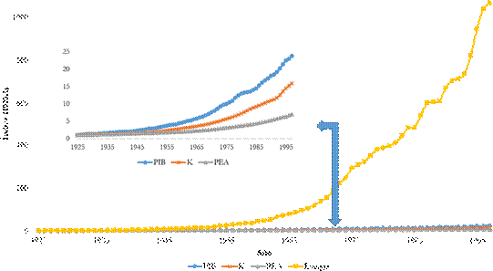 En la Figura 1 se puede observar que el crecimiento en el consumo de energía eléctrica en el país ha aumentado de manera acelerada a partir de los años 60, a una tasa que sobrepasa considerablemente la obtenida para los demás factores considerados. Nótese que dicho crecimiento es tan acelerado que oculta el crecimiento de los demás factores considerados en el estudio. Con el fin de que el lector pueda observar el crecimiento del PIB, el capital y la PEA se presenta, en la Figura 2, el índice (1925:1) de los factores de producción en Colombia incluyendo y excluyendo el consumo de energía eléctrica durante el periodo de tiempo considerado.