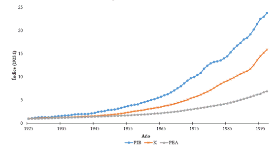 Figura 1 Índice 1925:1 del PIB y los factores de producción (Colombia, 19251997)
