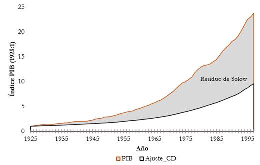La Figura 3 presenta claramente que la función Cobb-Douglas -sin considerar la exergía como tercera variable independiente, pero manteniendo la condición de rendimientos constantes y con elasticidades proporcionales a la participación en los pagos a los recursos de entrada en las cuentas nacionales- no explica el crecimiento histórico de Colombia en el largo plazo, pues se puede observar que los residuales del modelo ajustado crecen de forma exponencial.