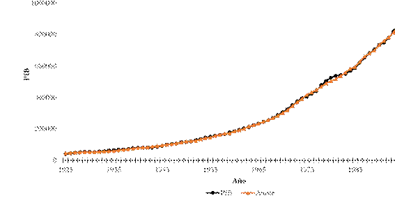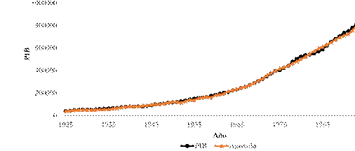 Figura 3 PIB vs ajuste modelo CobbDouglas con elasticidades fijas L (0,61775), K (0,38225) y E (0)