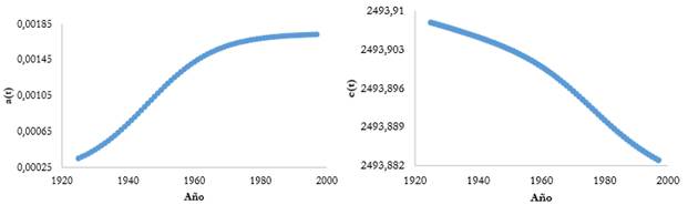En la Figura 6 se presenta el valor anual de los polinomios a t y c t enunciados en las ecuaciones (11) y (12) y calculados para el caso colombiano durante el periodo de tiempo considerado 1925-1997.