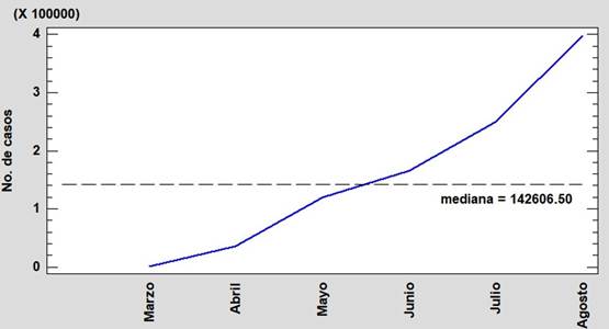 Se observa que la mediana de los casos durante el periodo de estudio fue de 142606,5 con una rápida evolución desde marzo, donde se reportaron 950 casos, hasta un máximo de 397999 al cierre del mes de agosto. En todo el periodo, la curva de contagios fue en aumento con un incremento fuerte entre julio y agosto, esto a pesar de las medidas de distanciamiento social, aislamiento, toque de queda y otras medidas adoptadas por el gobierno. Una prueba de análisis secuencial temporal indicó que la tendencia creciente de los casos es estadísticamente significativa (p < 0,05), lo que indica un aumento proporcional en el tiempo. Este crecimiento exponencial en el número de contagios reportados se debe, en parte, a la mayor difusión e implementación de pruebas de detección que llevaron a la confirmación más eficiente de los contagios, incluidas a las personas asintomáticas (Aragón y Cruz, 2020, Delgado, 2020).
