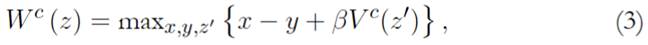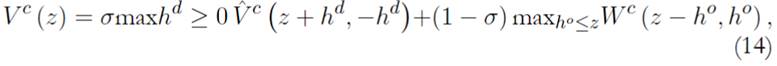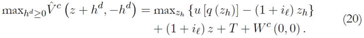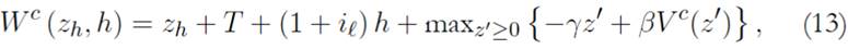 donde V c representa la función de valor del comprador al comienzo de un periodo. Según la ecuación 13, el comprador entra al MC, al final del día, con saldos reales zh y recibe transferencias T. Adicionalmente, el comprador recibe (1 + iℓ) pesos por cada unidad de h que posee. Es de notar que la elección óptima de saldos reales para el próximo periodo, z′, es independiente de la riqueza inicial del comprador, zh, y de los préstamos reales, h.
