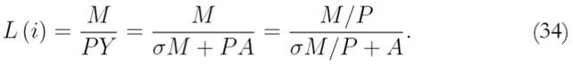 Por otra parte, una vez se tienen en cuenta las especificaciones de las funciones de utilidad y costo, es necesario obtener la función de demanda de dinero. Como se mencionó, si la tasa de interés nominal es mayor a cero, los agentes gastan todo su dinero en el MD. Por tanto, el PIB nominal del MD es igual a la multiplicación de la frecuencia de encuentros bilaterales y los balances monetarios agregados, σM. Por su parte, el PIB nominal en el MC es PA, donde A corresponde a la cantidad óptima de consumo en el MC4. Así, el PIB nominal se define como PY = σM + PA.