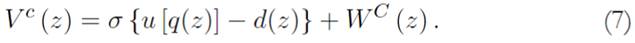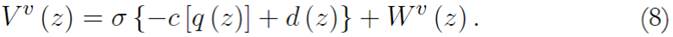 La ecuación (7) dice que la utilidad esperada de por vida de un comprador al comienzo del MD es la suma del excedente comercial, σ {u [q(z)] ─ d(z)}, más el valor de continuación en el siguiente MC, Wc (z). Nótese que el comprador se empareja en el MD con probabilidad σ, en cuyo caso consume q y transfiere los saldos reales d. Por tanto, el excedente comercial hace referencia a la diferencia entre la utilidad del consumo y la transferencia de saldos reales.