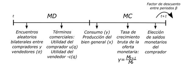 Al principio del MD, un comprador encuentra a un vendedor, y viceversa, con probabilidad σ < 1. Después de que un encuentro tiene lugar y se alcanza un acuerdo entre las partes, los agentes intercambian una cantidad del bien del MD, llamado bien de búsqueda, por dinero.