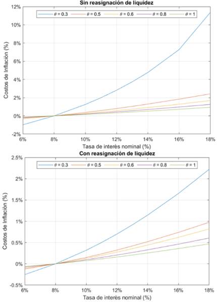 A través de una calibración, se encontró que el costo de bienestar asociado a una inflación positiva disminuye cuando se introduce la reasignación de liquidez. Así, por ejemplo, el costo de bienestar de reducir la inflación en 10 pp sin reasignación de liquidez, bajo el protocolo de negociación de Nash y con niveles de poder de negociación menores a 1, oscila entre 2,6 % y 4,2 % del PIB. En contraste, con reasignación de liquidez, tal rango es de 0,9 % y 3,6 % del PIB. Cuando los compradores tienen todo el poder de negociación, el costo de bienestar equivale a 0,94 % del PIB sin reasignación de liquidez, mientras que con reasignación de liquidez la cifra baja a 0,46 %. En el caso de la solución proporcional sin reasignación de liquidez, el costo de bienestar de una inflación de 10 % está entre el 1,2 % y 11,3 % del PIB. Dicho rango se ubica entre 0,6 % y 2,2 % para el caso con reasignación de liquidez.