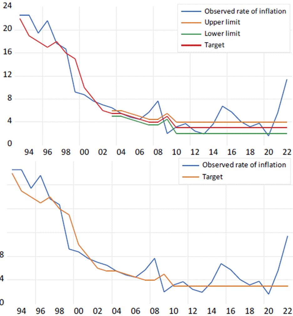 Since 1993, the Bank’s Board of Directors has focused on setting annual inflation targets and, since 2003, on establishing inflation bands in order to anchor the decisions of economic agents, align policy instruments, and ensure that inflation moves between two bands with a lower limit of 2% and an upper limit of 4% (with a long-term average target of 3%). It could be said that the central bank’s price stabilization policy has been relatively successful and has generated credibility and confidence among economic agents. The figures show that, in certain years and periods after the issuance of the 1991 Political Constitution, for example, since 1997, except in 1998 and in the periods 2006- 2008, 2015-2016 and 2021-2022, the observed inflation has been lower than the expected inflation, fully complying with the targets set, as shown in Figure 1.