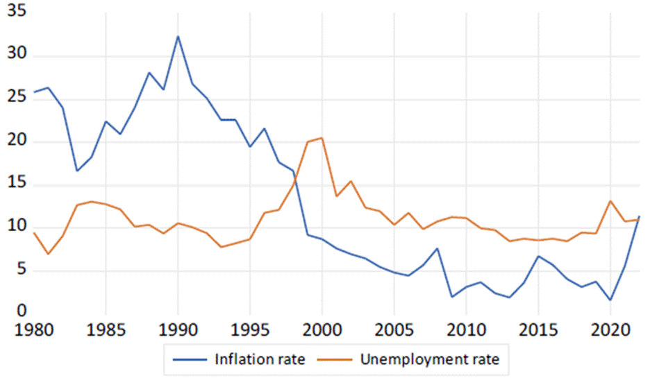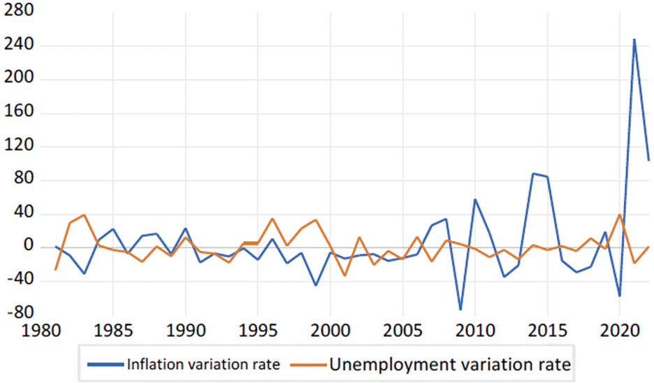 When representing the inflation and unemployment rates in Colombia for the period 1980-2022 in a line graph, it can be seen that from 1980 to 1997 inflation and unemployment were inversely related with a correlation coefficient of −0.74, but in 1998 this relationship changed drastically; a direct relationship emerged between inflation and unemployment with a correlation coefficient of 0.41 (the lower the inflation the lower the unemployment and vice versa); the relationship of association between these two economic variables even becoming weaker. If we take the entire period from 1980- 2022, the correlation coefficient is only −0.16. Several authors have shown in recent decades that, in most countries of the world, the relationship between the inflation rate and the unemployment rate (Phillips Curve) no longer exists in the classical form (Figure 2). Currently, the underlying empirical relationship is between the variation of the inflation rate and the variation of the unemployment rate.