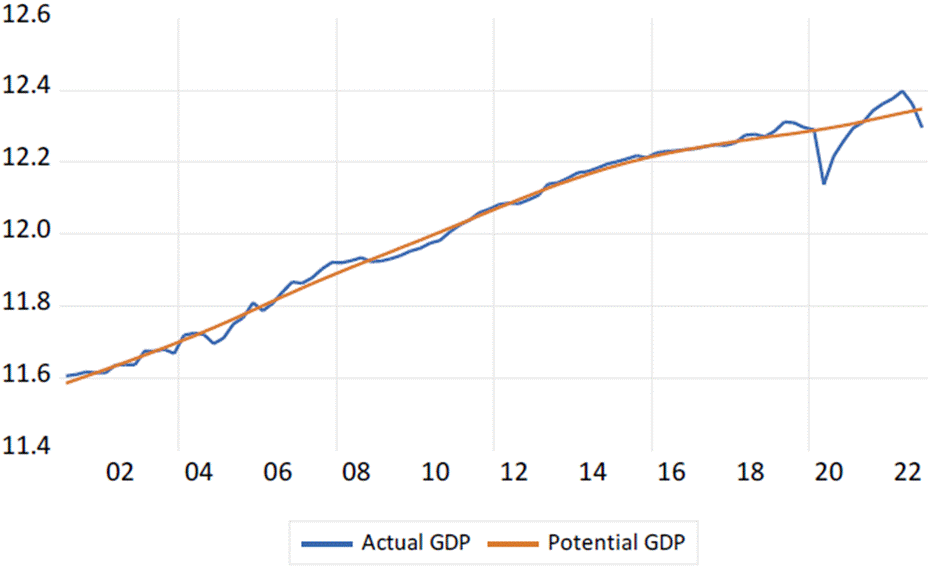 Using quarterly frequency series of GDP for the period 2001:1-2022:4, we proceeded to calculate Colombia’s potential GDP through a Hodrick-Prescott (1997) filter. In Figure 3, the blue line represents the actual or observed GDP recorded by DANE in the national accounts system and the red line represents the trend GDP. It is observed that in some quarters the blue line was below the red line and in others it was above it. There is a quite noticeable fact: in 2020 the blue line moved considerably downwards with respect to the red line. This year corresponds to the COVID-19 pandemic that caused GDP to fall to 6.8% with high unemployment and increased poverty. That situation is similar to the one experienced by Colombia in the Great Depression of the 1930s.