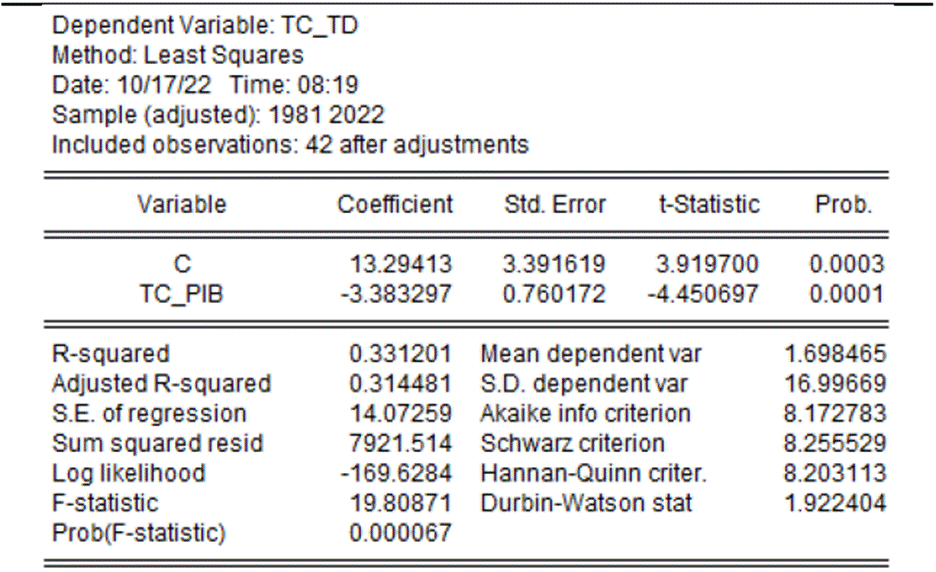 It is convenient to test for the Colombian economy the inconsistent relationship between GDP and unemployment in the framework of Okun’s Law with time series corresponding to the period 1980-2022 by means of an econometric model expressed in first differences (non-stationary series), based on the following specification: