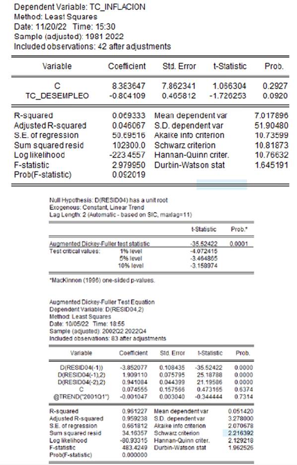 The natural rate of unemployment for Colombia in the indicated period was calculated from the quotient β 0 / β 1, replacing in the formula: 8.3837/ − 0.8041 = 10.4%. This value is consistent with theory since it is close to the average unemployment rate in the period 1980-2022 of 11.1%, although it differs from the NAIRU value estimated by Gómez & Julio (2000) of 8.4%, a value used by the Technical Committee of the potential GDP calculation and by the Technical Directorate of the Autonomous Committee of the Fiscal Rule of the Ministry of Finance and Public Credit for fiscal policy purposes.