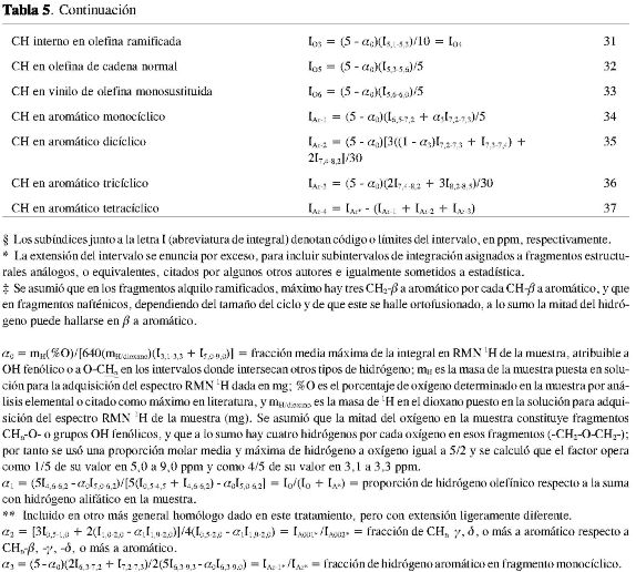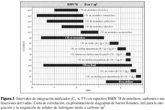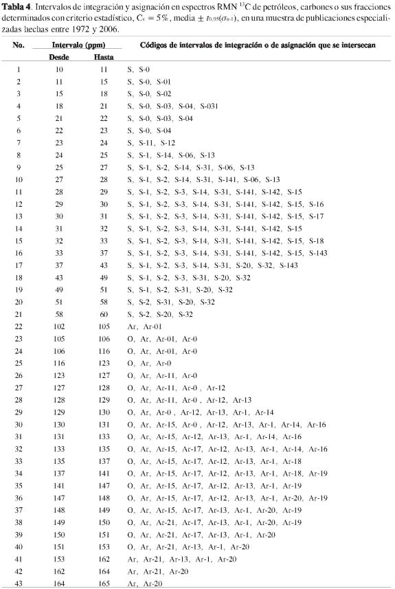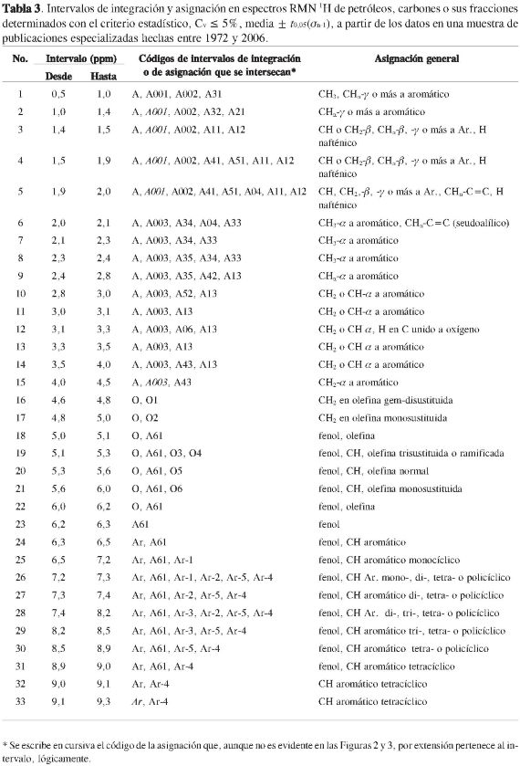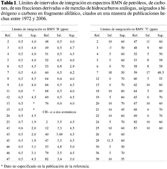 Se tuvo noción de la imprecisión de límites inferior y superior de los intervalos de integración citados y asignados por los autores, al revisar una muestra de 83 publicaciones de caracterización estructural de petróleos, de carbones, de sus fracciones derivadas (2-84), o, eventualmente, de mezclas sintéticas de hidrocarburos, análogos de estas (8, 14, 15, 21, 24, 37, 43). Por ejemplo, la Tabla 1 presenta distintos límites de intervalos de desplazamiento químico en espectros RMN 1Ho RMN 13C, asignados a señales de hidrógeno en fragmento alifático, según sea la publicación consultada.