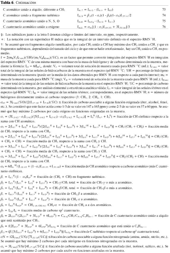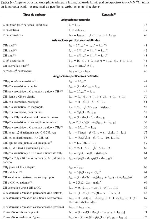La resonancia magnética nuclear (RMN), una técnica analítica no destructiva que se fundamenta en la interacción de núcleos activos con un campo magnético intenso, ha sido usada extensivamente para la caracterización estructural de petróleos, carbones o sus fracciones derivadas a partir de sus espectros RMN 1H y/o RMN 13C, desde 1958 (1). Las dificultades experimentadas en la aplicación e interpretación detallada de otras técnicas y la factibilidad de estudiar la funcionalidad del hidrógeno y del carbono en la estructura para la determinación de las propiedades de tales materiales han suscitado el interés general por el uso de la RMN para tal fin (2). Algunas metodologías para la caracterización de tales muestras mediante la cuantificación de fragmentos estructurales por RMN [Williams (1), Knight, Brown y Ladner, Clutter y Petrakis, Rongbao (3,4), etc.] gozan de reconocimiento y aceptación, aun con las acotaciones que los autores expresamente asumen para sustentarlas y hacerlas coherentes.