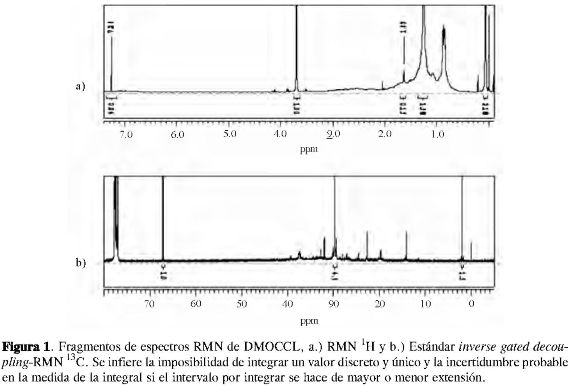 Los espectros RMN 1H y RMN 13C que se presentan, se adquirieron de una muestra de aceite desmetalizado de fondos de vacío de crudo Caño Limón (DMOCCL), provista por Ecopetrol, Barrancaberme-ja, disuelta en CDCf,, 99,8%-d con 0,03% de TMS, en concentraciones de 4% P/V para hidrógeno, y 25% P/V para carbono, en un espectrómetro Bruker Avance 400, con una sonda BBO estándar de 5 mm, que opera a 400,13 MHz para hidrógeno-1 y a 100,6 MHz para carbono-13. Se adicionaron hexametildisiloxano (HMDS) y dioxano a la muestra, como patrones internos para cuantificación. Los espectros RMN 1H se adquirieron con tiempo de reciclo de 1s y 16 scans, compilando 65536 puntos cada uno. Los espectros RMN 13C se adquirieron mediante la secuencia estándar inverse gated decoupling (igd-), con tiempo de reciclo de 5 s y 1028 scans, compilando 32768 puntos cada uno, y se usó acetilacetonato de cromo (III), 0,05 M como agente de relajación en la muestra. Las FIDs fueron procesadas con el software Mestrec 4.9.8.0®.