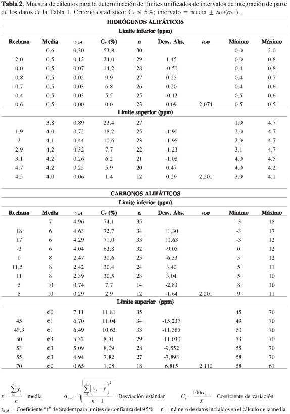 Para establecer límites unificados a partir de los datos publicados de intervalos de integración en los espectros RMN de petróleos, de carbones o de sus fracciones derivadas, los límites inferior y superior de tales intervalos, discriminados en razón a su asignación y por separado, se sometieron a un tratamiento estadístico para hallar la media aritmética, x, de los datos que con un 95% de confianza quedasen incluidos en el intervalo x ± tσn_1, al tenor de la distribución "t" de Student (85), tras rechazar cualquier dato extremo cuya inclusión en el cálculo de la media produjese una desviación estándar, σn_1, tal que el coeficiente de variación, Cv, resultase mayor a 5%. La Tabla 2 da una muestra de cálculos de ese tratamiento, aplicado a parte de los datos consignados en la Tabla 1, para establecer límites inferior y superior promedio de los intervalos de integración, ahora unificados (0,5 a 4,0 ppm y 10 a 60 ppm), de las señales en RMN 1HoenRMN 13C atribuidas a hidrógeno o a carbono en fragmento alifático, respectivamente.