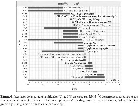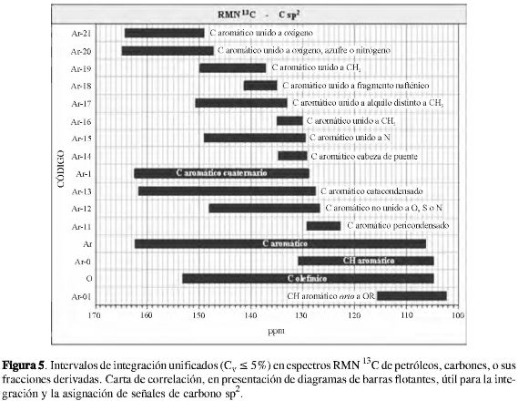 Cálculos como los consignados en la Tabla 2, hechos para otras asignaciones y límites de intervalo citados en las publicaciones, permitieron elaborar las cartas de correlación en espectros RMN 1H y RMN 13C de petróleos, carbones, o sus fracciones, que se muestran en las Figuras 2 a 5, en las cuales los límites de los intervalos de integración unificados que resultaron del tratamiento estadístico se representaron, se definieron, según las asignaciones hechas por los autores, y se les asoció un código para facilitar la expresión abreviada de la intersección que se observa entre ellos.