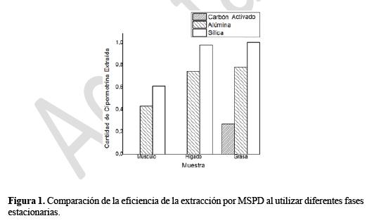 Cheng y colaboradores usaron un método por MSPD para la extracción de cipermetrina en tejido de porcinos en el cual utilizaron acetonitrilo como solvente y alúmina como fase estacionaria, obteniendo una recuperación de 83,50%, que es menor a la obtenida en este método usando acetona como solvente de elución (14).