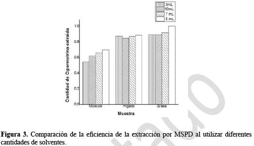 La evaluación de los parámetros para el proceso de extracción (Tipo de fase estacionaria, tipo de solvente y cantidad del mismo) se llevaron a cabo utilizando 0,20 g de muestra de tejido (músculo, hígado o grasa perirrenal), adquirido en un mercado de la ciudad, posteriormente dopado hasta una concentración en muestra de 40,00 µg/Kg de cipermetrina, la muestra se dejó en reposo y refrigeración durante 24 h, posteriormente fue macerada y homogenizada con 0,80 g de la fase estacionaria (Sílica, alúmina o carbón activado). Esto se transfirió a una jeringa desechable de 5,00 mL, la cual contenía en su interior una capa de lana de vidrio, una de sulfato de sodio, una de la mezcla de la muestra con la fase estacionaria y finalmente una nueva capa de lana de vidrio; a continuación se compactó. Posteriormente se eluyó con 5,00 mL del disolvente (Acetona, acetonitrilo o mezcla de los dos) en un equipo de SPE (Máx 20"Hg) y se concentró a 1 mL. Una vez definido el solvente, se evaluaron diferentes volúmenes (3, 5, 7 y 10 mL) del mismo. Los ensayos llevados a cabo se realizaron por triplicado. Enseguida se procedió a inyectar 1µL de esta solución en el cromatógrafo para la determinación y cuantificación del analito.