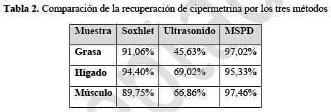 Se compararon los resultados obtenidos para la extracción de fracciones de una misma muestra con MSPD frente a Soxhlet, como método de referencia, y ultrasonido. Los resultados obtenidos para ultrasonido y Soxhlet, expresados como recuperaciones frente a la concentración obtenida usando MSPD, se presentan en la tabla 2. MSPD proporcionó valores análogos a Soxhlet y superiores a ultrasonido, siendo la primera técnica más sencilla y menos costosa. Con ultrasonido y MSPD se pueden extraer varias muestras simultáneamente, contrario a Soxhlet, en el cual solo se puede tratar una muestra por extracción.