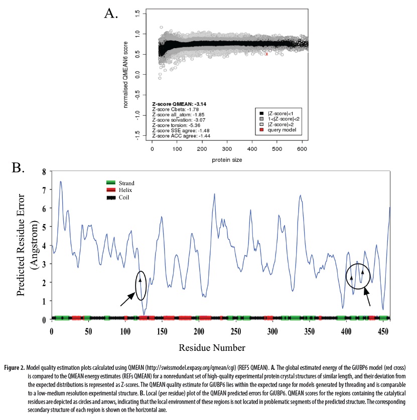 Protein structure models are computational predictions that may contain errors. Since the criteria used to choose the best model for GiUBP6 are not an indication of the global quality of the model, the wellknown QMEAN and QMEAN Z-score parameters were used (24, 40). These score functions are widely used to validate experimental structures as well as theoretical models. The used QMEAN scoring function gives a normalized global score of the whole model reflecting the predicted model reliability ranging from 0 to 1 with higher values for more reliable candidates. The normalization reduces the dependence of the quality score on the size of the model. Besides, the QMEAN Z-score provides an estimate of the absolute quality of a model by relating it to reference structures solved by X-ray crystallography. This is an estimate of the "degree of nativeness"of the structural features observed in a model by describing the likelihood that a model is of comparable quality to high-resolution experimental structures. The QMEAN and QMEAN Z-score values obtained for the GiUBP6 model were 0.506 y -3.14 respectively. Both values lie within the expected range for a model obtained by threading since this technique is usually more susceptible to errors compared to homology modeling. According to those results, the reliability of the model obtained for GiUBP6 is comparable to a lowmedium resolution experimental structure (Figure 2A).