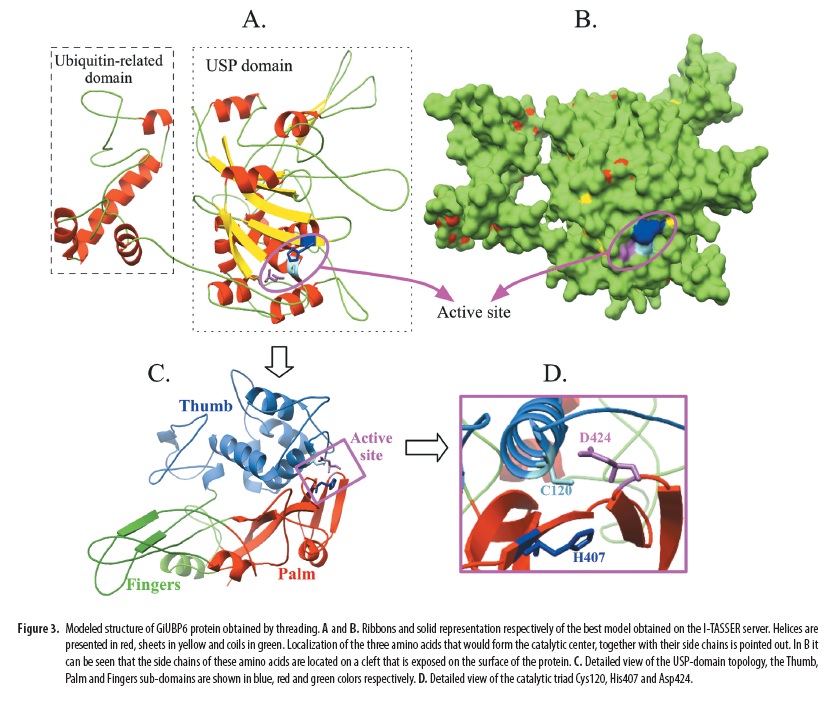 Being similar in domain distribution and structure to USP14/UBP6 of humans and yeast respectively, the function of GiUBP6 in Giardia could be also related to that of proteins, a good point to test in wet experiments. This hypothesis is consistent with the decrease of the expression during the encystation process, which would have a direct effect on increasing the specific protein degradation.