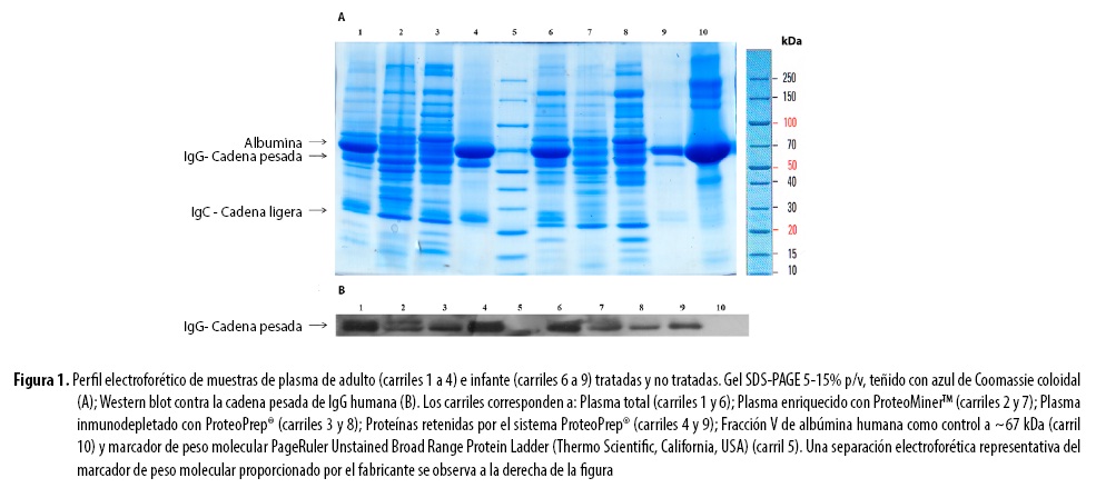 En la Figura 1A se muestra el patrón de separación electroforética de las muestras de plasma de adulto (carriles 1-4) e infante (carriles 6-9); muestras sin tratar y tratadas con los sistemas de reducción de la complejidad plasmática. Con los dos sistemas se evidencia un aumento en el número de bandas de proteína en las muestras tratadas (carriles 2 y 7 con ProteoMinerTM; carriles 3 y 8 con ProteoPrep®) en comparación con las no tratadas (carriles 1 y 6). Esto se relaciona con la reducción de la concentración de proteínas de mayor abundancia como la albúmina (banda a ∼67 kDa; control en carril 10) y la inmunoglobulina G (cadena pesada de ∼50 kDa y ligera de ∼25 kDa), como se confirma en el análisis por inmunoensayo contra la cadena pesada (Figura 1B).