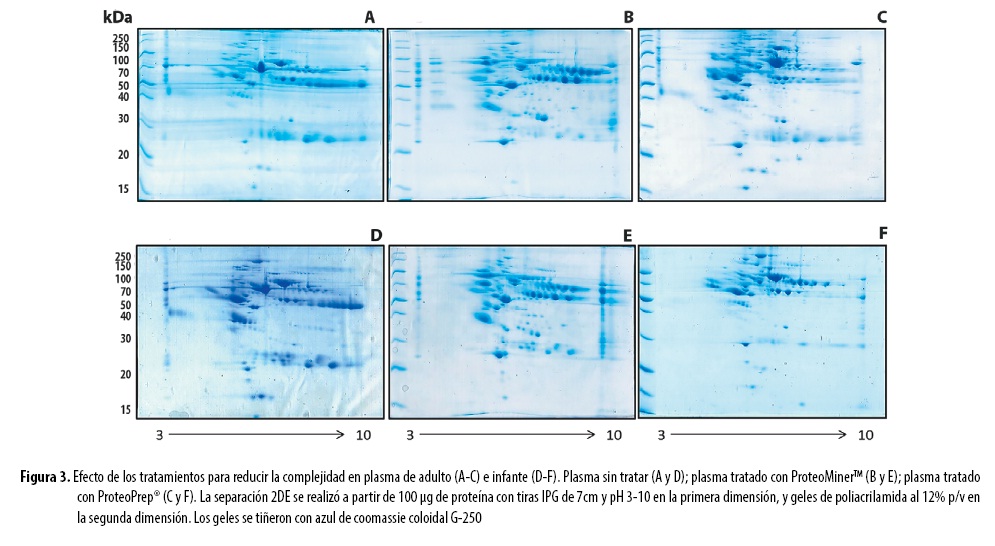 Una vez establecidos los protocolos de preparación de la muestra, se compararon los perfiles 2DE de plasma humano sin tratar y tratado con las dos metodologías. En la Figura 3, se muestran los geles 2DE de plasmas no tratados (Figura 3A y Figura 3D), enriquecidos en proteínas de baja abundancia (Figuras 3B y 3E) o inmunodepletados (Figuras 3C y 3F) de adulto e infante, respectivamente. En comparación con los perfiles proteómicos de muestras sin tratar, en las muestras tratadas se observa una disminución en la intensidad de spots predominantes y una mejor discriminación de spots menos intensos. Lo anterior, está relacionado con la capacidad que tienen estos métodos de reducir el rango dinámico de proteínas en plasma.