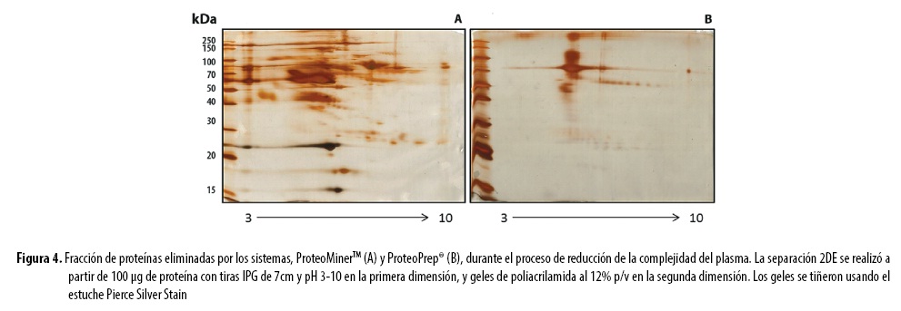De acuerdo a lo anterior, ambos métodos empleados resultaron efectivos en la reducción de la concentración de albúmina e IgG de plasma humano, permitiendo la detección de un mayor número de bandas, especialmente de bajo peso molecular, en comparación con el plasma no tratado.