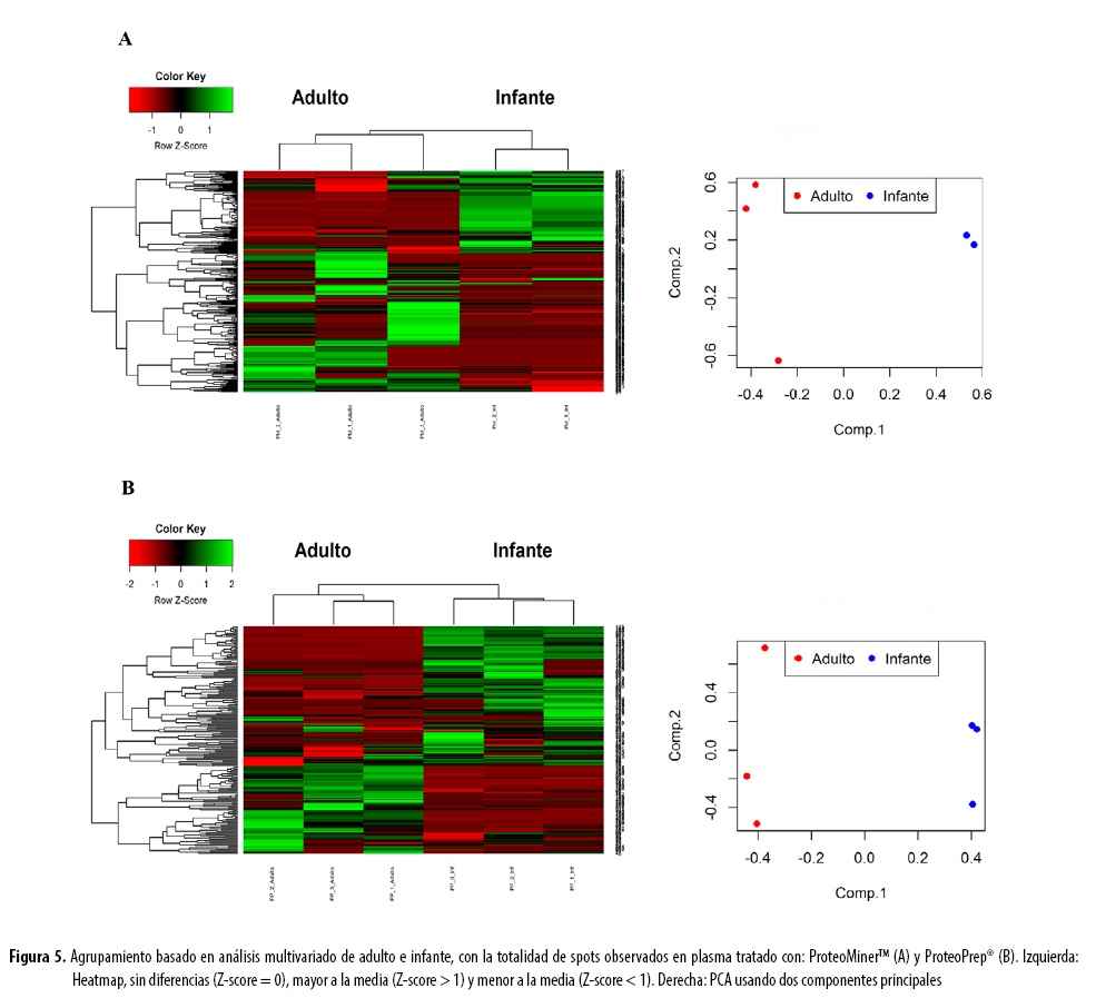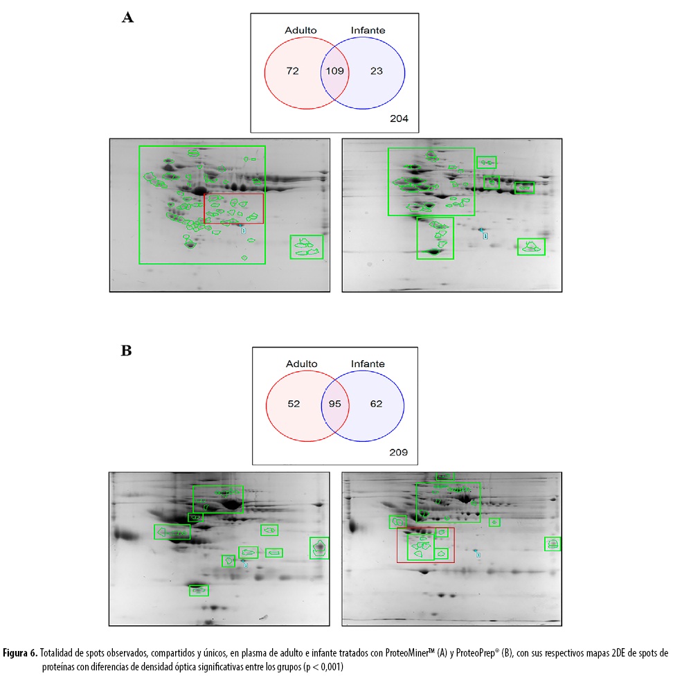 Los métodos de agrupamiento, basados en análisis multivariado (Heatmap y PCA), permitieron evidenciar la similitud de las réplicas técnicas dentro de cada grupo, así como las diferencias entre infante y adulto, con ProteoMinerTM (Figura 5A) y con ProteoPrep® (Figura 5B). En los diagramas de Venn (Figura 6) se observa que la totalidad de los spots compartidos detectados con los dos tratamientos empleados, fueron similares.