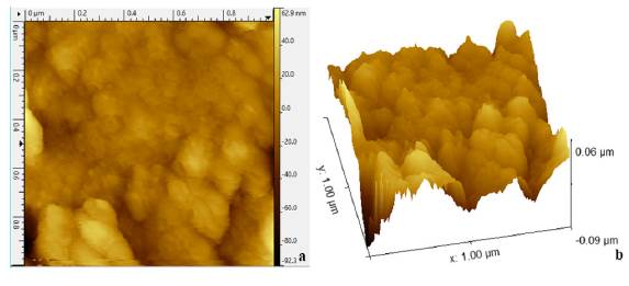 La microscopía de fuerza atómica arroja los perfiles del catalizador soportado en los anillos. En la figura 6a se pueden observar granos esféricos uniformes y aglomerados, con algunos vacíos en su superficie; en la figura 6b, la superficie del TiO2 dopado muestra microestructuras granulares compuestas de partículas irregulares con altura del pico más alto de 0,06 Lm y una profundidad de valle más bajo de -0,09 Lm, teniendo en cuenta un área de barrido de 1,0 X 1,0 µm. Además, el análisis proporciona parámetros de rugosidad superficial, la cual en promedio tiene un valor de 10,7145 nm, indicando esto que la superficie no es ópticamente lisa.