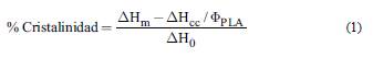 Donde ∆Hm es la entalpía de fusión, ∆Hcc es la entalpía de cristalización en frío, Φpla es el contenido de PLA en la mezcla y ∆H0 es la entalpía de fusión del PLA 100% cristalino (93,6 J/g).