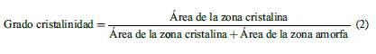 Se utilizó el área bajo la curva para determinar la cristalinidad de las mezclas según el método del grado de cristalinidad, que es un método directo y se basa en la estimación de que la intensidad o el área total contribuyen al patrón de difracción en general de cada componente del análisis. Se empleó la Ecuación (2).