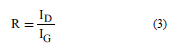 Otra banda característica del grafito se observa a los 1295 cm-1 y se conoce como la banda D o banda inducida al desorden por fotón, la cual se atribuye a la presencia de desorden en los alótropos del carbono. Esta banda está más asociada a enlaces de carbonos tipo sp3 que sirven como sitios de nucleación de hidrógenos. El espectro Raman también exhibe una banda a los 2440 cm-1 que se llama banda G' y se atribuye a un sobretono de la banda G [49]. Para determinar la cristalinidad de los nanotubos de carbono se utilizó la relación entre la intensidad de la banda G y la intensidad de la banda D, como se muestra en la Ec. (3).