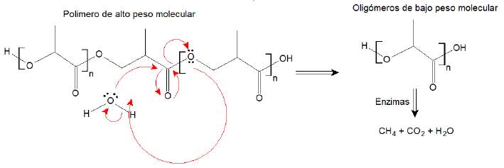Por otro lado, casi todos los plásticos convencionales, como polietileno (PE), polipropileno (PP), poliestireno (PS) y policloruro de vinilo (PVC) son resistentes al ataque microbiano; contrariamente, en los poliésteres alifáticos como PLA hay una fácil degradación por los microorganismos presentes en el medioambiente. La degradación de PLA se ha estudiado en los seres vivos para aplicaciones médicas, como implantes, suturas quirúrgicas y liberación de drogas. En estos entornos, el PLA se degrada inicialmente por la hidrólisis y los oligómeros solubles formados son metabolizados por las células [6]. La degradación de PLA en el medioambiente es más difícil que en entornos controlados porque el PLA es resistente al ataque de microorganismos en el suelo o las aguas residuales en condiciones normales. El polímero primero se debe hidrolizar (figura 1) a temperaturas elevadas (aproximadamente 58 °C) para reducir el peso molecular antes de que la biodegradación pueda comenzar [7].