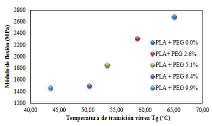 En la figura 16 puede observarse la comparación entre el módulo de flexión con respecto a la transición vitrea (DMTA) de las muestras. Como se aprecia, el valor de transición vitrea es de 61,23 °C para el PLA y se reduce a 43,5 °C cuando se le añade 9,9% de PEG.