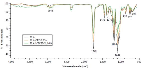 A los 1749 cm-1 de igual forma puede observarse la banda por vibración longitudinal del grupo carbonilo presente en éster, la banda presente a 1185 cm-1 es debida a las vibraciones longitudinales en los enlaces C-O presentes en los grupos éster del PLA y grupos éter del PEG. Las demás bandas también se observan en el espectro del PLA y pueden de igual forma atribuirse a este espectro [72].