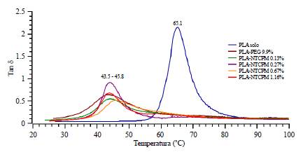 Se observa cómo los valores de tan 5 se ensanchan y disminuye la intensidad con respecto a la curva de PLA de todas las mezclas restantes, esto es un indicativo de que los NTCPM no tienen un efecto sobre la transición vítrea, los valores son muy similares al variar la concentración. Por lo tanto, los NTCPM no le dan mayor rigidez a la estructura, los nanotubos no restringen la movilidad de las cadenas de polímero y es mayor el efecto plastificante del PEG, que les da mayor movilidad a las cadenas de la zona amorfa del polímero [74].