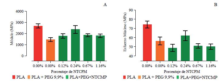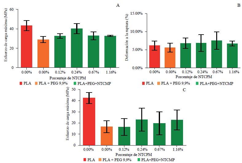 Al añadir PEG a la mezcla el esfuerzo de carga máximo se ve reducido considerablemente, el PEG 300 es un material liquido y su función es la de hacer flexible a la matriz polimèrica, por lo que se requiere menos energia para elongar esta mezcla. Al agregar NTCPM se observa un incremento en el esfuerzo de carga máxima en el caso de las mezclas al 0,12% y 0,24%, donde el incremento ya es considerable. La razón por la que se requiere mayor energía para elongar estos materiales es que los NTCPM se han dispersado bien en la matriz polimèrica y, por lo tanto, han reforzado el material, las cadenas de polímero son más rígidas gracias a esta interacción y se requiere mayor energía para elongar estas mezclas. Como se mencionó anteriormente, las mezclas con NTCPM a 0,67 y 1,16% contienen una cantidad de NTCPM que producen una separación de fases y la interacción no es efectiva cuando los materiales se confinan entre si, evitando una interacción efectiva de las mezclas.