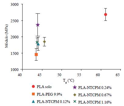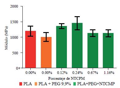 El gráfico puede seccionarse en 3 zonas, la primera cuando al PLA se le añade PEG, la segunda cuando se añade NTCPM hasta el punto de mayor módulo de tensión y la tercera zona es aquella en la que hay presencia de NTCPM, pero el módulo de tensión se va reduciendo. En la primera zona el PLA presenta un módulo de tensión de 1193 MPa y cuando se le añade PEG al 9,9% se reduce a 1003 MPa. Esta tendencia se explica por el efecto plastificante que tiene el PEG sobre el PLA.