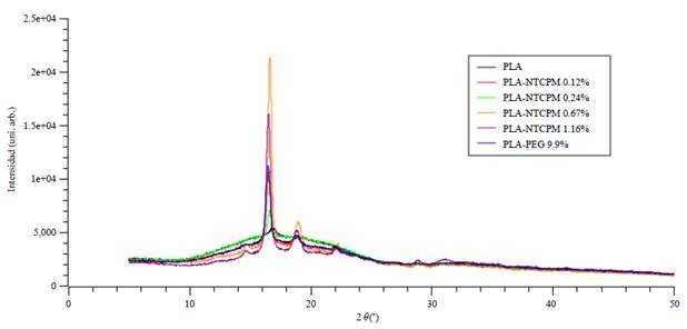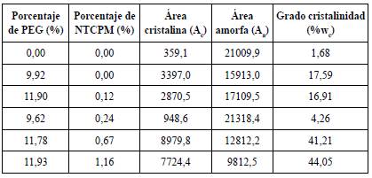 Para el cálculo de la cristalinidad se empleó la Ecuación 2 y el software GraphPad Prism 6 para realizar la integración del área bajo la curva de las señales de los difractogramas [81]. Se observa un incremento en la cristalinidad al agregar PEG al 9,9%, esta se mantiene muy similar cuando se agregan NTCPM al 0,12%, por lo tanto, añadir NTCPM a esta concentración no genera una nucleación considerable en la matriz polimèrica. Se observa que al añadir NTCPM al 0,24% se presenta una reducción de la cristalinidad en peso, lo cual podría deberse a que esta configuración lleva el sistema hacia el desorden. La adición de NTCPM a 0,67 y 1,16% genera un incremento considerable en la cristalinidad de la matriz, de forma que a esta concentración los NTCPM funcionan como agentes nucleantes de la estructura de PLA. En la tabla 10 se observan los valores obtenidos de área de fase amorfa y cristalina.