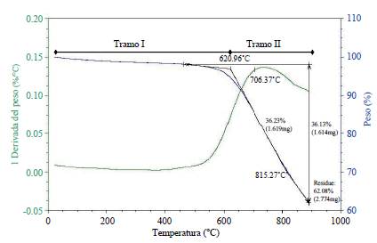 Se empleó un equipo marca TA Instruments® (modelo TGAQ500), según la metodología ASTM E-1131-3, en la que se colocan muestras con peso entre 5-10 mg en una cápsula abierta metálica. Se hizo un barrido de temperaturas hasta 900 °C con una rampa de calentamiento del horno de 10 °C/min en una atmósfera inerte utilizando nitrógeno [24].