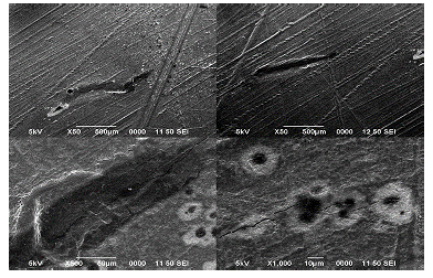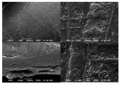 Se cortaron piezas de 4 x 4 mm de cada muestra y se fijaron sobre una cinta de doble cara carbón/aluminio. Se realizó un recubrimiento de 5 nm de espesor de Au en un cobertor iónico modelo EMS 550 X. Las placas se analizaron en un microscopio electrónico de barrido (SEM) marca Jeol®, modelo JSM-6390LV.