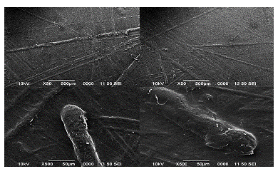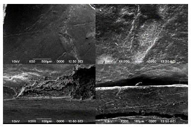 En las micrografías de las placas al 0,24%, se pueden observar estructuras homogéneas y uniformes, algunas fisuras poseen poca bifurcación y las rupturas se dan en la misma dirección [84-86]. En las placas al 0,67%, no se observan rupturas, es homogénea y presenta algunos relieves producto de aglomeraciones de fibras de PLA [84-86]. Finalmente, en las placas al 1,16%, se observan zonas homogéneas de fibras de polímero, además de una fractura en forma de corte, que se propaga en distintas direcciones, se observa que este corte genera una fractura en la parte superior, no se logra observar bifurcación [84-86].
