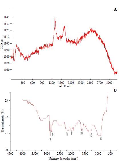 Se utilizó un equipo marca Thermo Scientific®, modelo Nicolet 6700 empleando un atenuador de reflectancia. Se realizó un barrido en un intervalo de onda de 400 a 4000 cm-1 [28]. Para RAMAN, se usó un microscopio RAMAN marca Witec®, modelo Alpha300 AR; el experimento se llevó a cabo con una longitud de onda de 514 nm desde un láser sintonizable de argón centrado en la muestra por medio de un objetivo 100x de 0,9 de apertura numérica. La intensidad del haz usada fue de 1 mW [29].