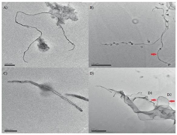 Figura 6 Microscopías TEM de los NTCPM. Cinco NTCPM fueron medidos en estas cuatro mocrografías. En rojo se señala el nanotubo que fue medido en las micrografías donde hay más de un NTCPM.