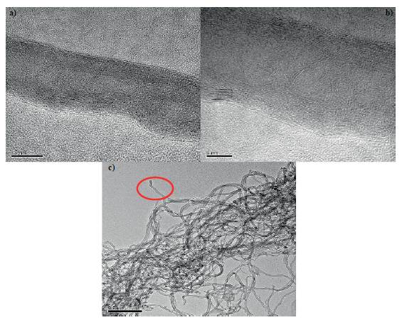 En la figura 7 se muestran imágenes de microscopía electrónica de transmisión de alta reolución (HR-TEM). Por medio de estas se pudo determinar que los nanotubos tienen de 16 a 26 paredes, con un promedio de diámetro externo en figura 7a de 23,95 nm y diámetro interno de 9,08 nm; en la figura 7b se presenta un promedio de diámetro externo de 23, nm y diámetro interno de 10,07 nm. En la figura 7b se realizó un estudio de la distancia entre paredes, en los puntos donde hay 16 paredes se obtuvo un total de 0,78 nm y en la zona en la que hay 26 paredes se apreció una distancia de 0,61 nm. También puede observarse cómo las paredes de grafeno internas se puentean periódicamente, lo que indica que poco a poco se va cerrando el tubo hasta que se interconecta la pared más externa. Estas zonas analizadas son rectas, por lo que se descartan irregularidades en la estructura del tubo como zonas con pentágonos, heptágonos u octágonos. Tampoco se observan residuos carbonosos dentro de la estructura, lo que sugiere que la estructura no ha sido rasgada en esta zona [61-63].