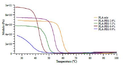 En la figura 14 se muestran las gráficas de módulo dinámico de almacenamiento (E1) al variar la temperatura de las mezclas. Como se ha explicado, el PEG funciona como plastificante y provoca el aumento de propiedades viscosas del PLA. Las mezclas con PEG pierden su rigidez a temperaturas por debajo de la Tg.